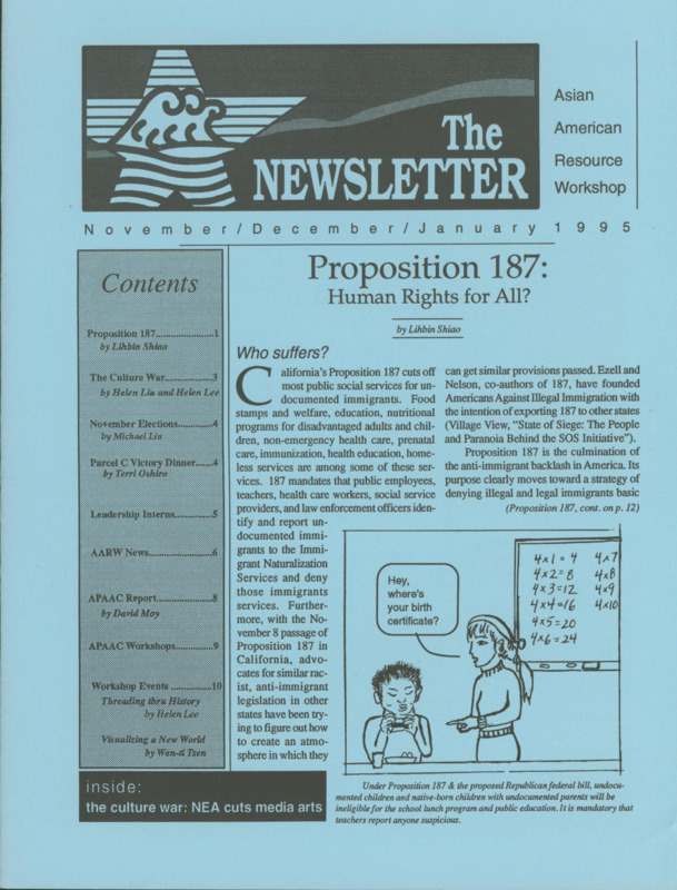 This is a newsletter published in January of 1995. The collection of articles displayed in this newsletter discuss the inhumane laws Asian and Pacific Americans dealt with and fought against. The articles in this newsletter raise concerns about political policies that are unjust and impacting Asian and Pacific American communities.