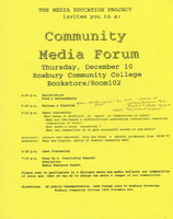 Community Media Forum Yellow flyer for a “Community Media Forum” organized by the Media Education Project at Roxbury Community College. The event is held on Thursday, December 10 in the college bookstore (Room 102). The program includes 4:30 p.m. registration with food and refreshments; 5:00 p.m. welcome and overview; 5:15 p.m. panel discussion with editors and reporters from the Globe and Herald and producers from WCVB TV, moderated by Mary Ann Crayton, editor of Roxbury Community News; 6:45 p.m. open discussion; and 7:30 p.m. wrap-up, evaluation, and distribution of a media resource packet. The panel addresses how news media represents communities of color, what makes reporting on these communities difficult, what makes a story newsworthy, and how communities can gain better access to the media. Directions at the bottom explain how to reach Roxbury Community College at 1234 Columbus Avenue by Orange Line to Roxbury Crossing.