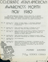 Celebrate Asian American Awareness Month Program Materials for Hito Hata Screening This set of materials documents a November 1980 Asian American Awareness Month event at Harvard University featuring a screening of Hito Hata. The collection includes a printed flyer announcing the Asian American Seminar’s Monday evening series on Asian American films, culture, and community issues, as well as handwritten program notes outlining the schedule, speakers, and affiliated organizations. These notes reference introductions by members of Visual Communications, remarks dedicated to the experiences of Issei, and contributions from groups such as the Asian American Resource Workshop, the Japanese American Citizens League, and the East Coast Asian Students Union. Together, these documents illustrate community organizing efforts, Asian American media advocacy, and student activism during this period.