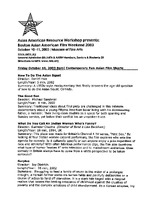 Boston Asian American Film Weekend 2003 Program (Page 1) This program guide documents the 2003 Boston Asian American Film Weekend, organized by the Asian American Resource Workshop (AARW) at the Museum of Fine Arts, Boston. It features a selection of films, a list of directors, screening schedules, and participating community organizations.