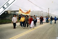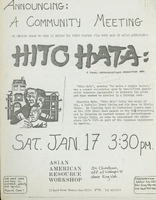 Hito Hata Community Meeting Poster A poster advertising an upcoming community meeting to discuss the distribution of Hito Hata, the first feature-length Asian American film, in Massachusetts. On the back, someone has written down possible points of contacts, presumably from the community meeting.