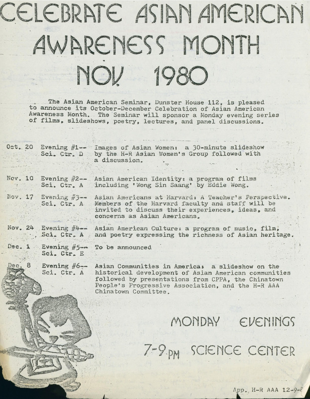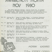 This set of materials documents a November 1980 Asian American Awareness Month event at Harvard University featuring a screening of Hito Hata. The collection includes a printed flyer announcing the Asian American Seminar’s Monday evening series on Asian American films, culture, and community issues, as well as handwritten program notes outlining the schedule, speakers, and affiliated organizations. These notes reference introductions by members of Visual Communications, remarks dedicated to the experiences of Issei, and contributions from groups such as the Asian American Resource Workshop, the Japanese American Citizens League, and the East Coast Asian Students Union. Together, these documents illustrate community organizing efforts, Asian American media advocacy, and student activism during this period.