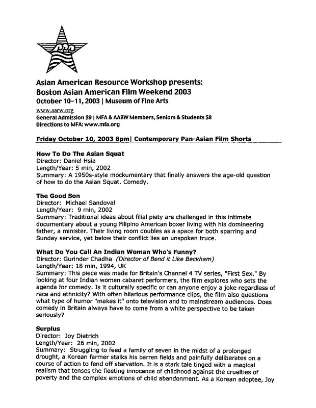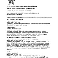 This program guide documents the 2003 Boston Asian American Film Weekend, organized by the Asian American Resource Workshop (AARW) at the Museum of Fine Arts, Boston. It features a selection of films, a list of directors, screening schedules, and participating community organizations.