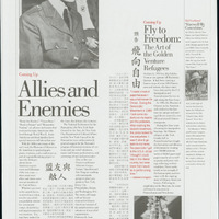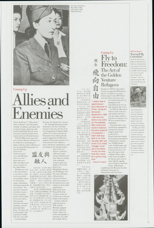 A selected page from the Winter 1996 edition of the Bu Gao Ban. The first article featured on the page, "Allies and Enemies," aims to inform readers of a new project to begin the dialogue centering around Asian American experiences during World War II. The second article, "Fly to Freedom: The Art of the Golden Venture Refugees," highlights a new installation at the museum that displays the art created by 50 incarcerated Chinese immigrants. The column, "Did You Know?," discusses the portrayal of minorities in movies during the war.