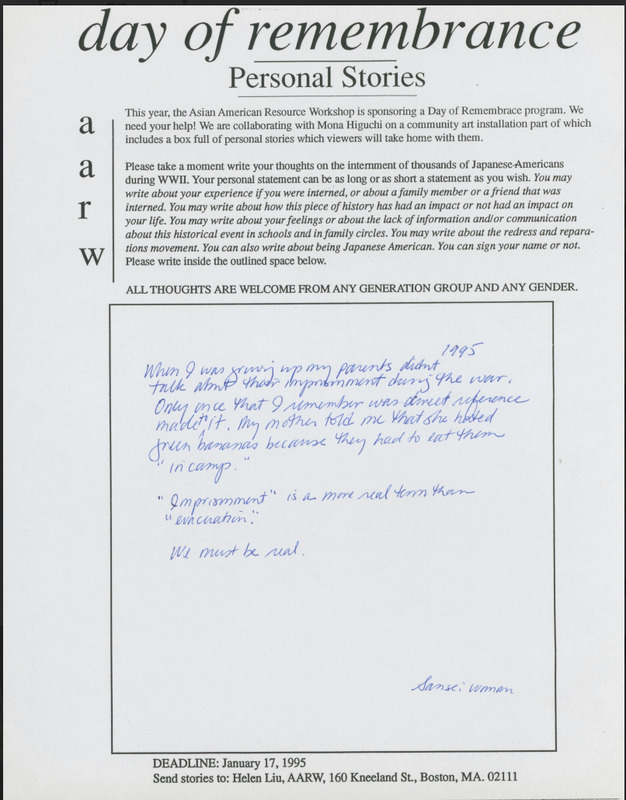 Asian American Resource Workshop Day of Remembrance 1995 Personal Stories
