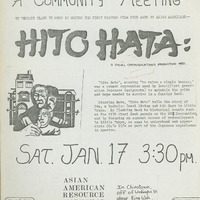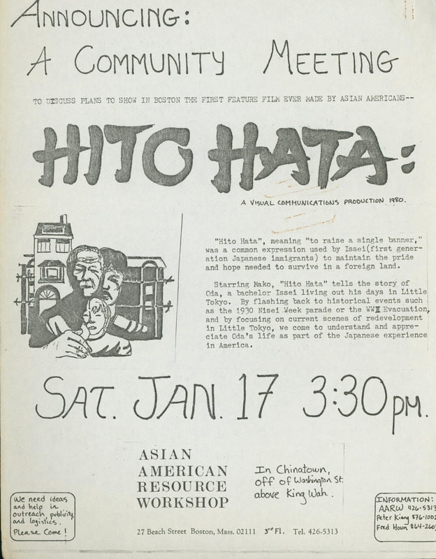 - A poster advertising an upcoming community meeting to discuss the distribution of Hito Hata, the first feature-length Asian American film, in Massachusetts. On the back, someone has written down possible points of contacts, presumably from the community meeting.